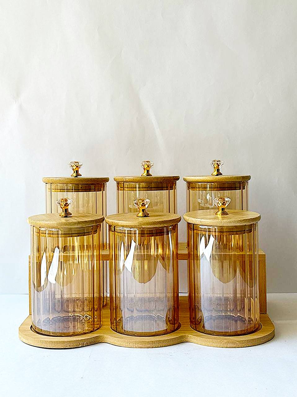 107050 ست بانکه شیشهای عسلی با پایه چوب بامبو – 6 تکه دربدار